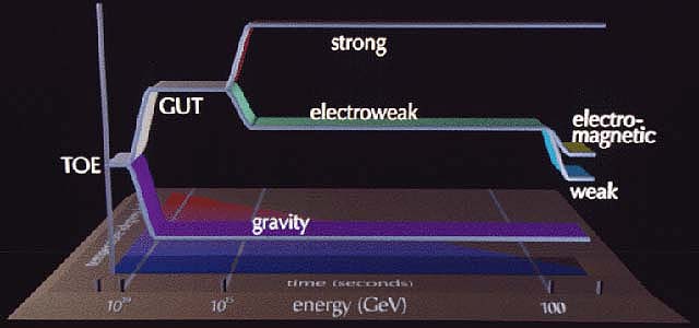 grand unified theory (GUT): A model for unifying the strong nuclear force, the weak nuclear force, and the electromagnetic force at very high energies. Ultimately, it is hoped to extend GUT to incorporate gravity (possibly by superstrings) to create a theory of everything (TOE). Several such GUTs have been proposed, but not yet experimentally verified.