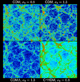 hot dark matter (HDM): A type of dark matter that was moving at close to the speed of light 10,000 years after the Big Bang. An example of a hot dark matter candidate is the massive neutrino. HDM would produce large-scale structures first (supercluster, clusters) which would then fragment into individual galaxies.