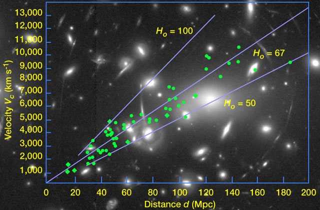 Hubble constant: Or H0, the ratio of velocity (v) to distance (D) in the expansion of the Universe, so v = H0D. The "0" [pronounced "naught"] on H0 means the current value, since the Hubble "constant" changes with time (but it is the same everywhere in the Universe at a given time).