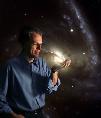 Dr Micheal Drinkwater closely examining the barred spiral NGC 1365 in the Fornax cluster. Credits: UQ Communications/European Southern Observatory (background).
