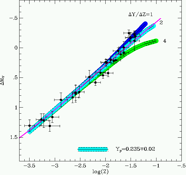 This plot shows how the luminosity (y-axis) of K dwarf stars increases as the amount of Helium (denoted by Y) and heaver elements (denoted by Z) increases. The data points represent real K dwarf stars observed with the Hipparcos satellite. Three computer calculations are shown by the dark blue, light blue and green lines: they represent different amounts of Helium produced in stars relative to the amount of heavier elements. The data indicate that the amount of Helium produced has been twice the amount of all the heavier than Helium elements combined (purple line). - from C. Flynn Press Release
