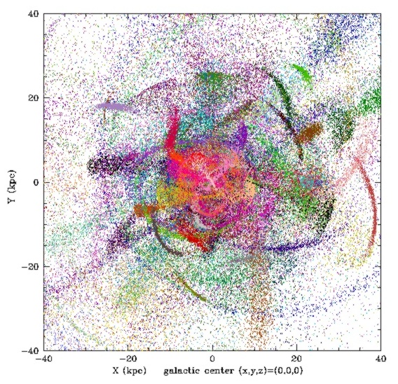 The image above, made from models by Paul Harding, shows what a halo might look like which was formed by accretions at various times during the last 10 Gyr of 50 dwarf galaxies. see http://smaug.astr.cwru.edu/heather/spag.html below