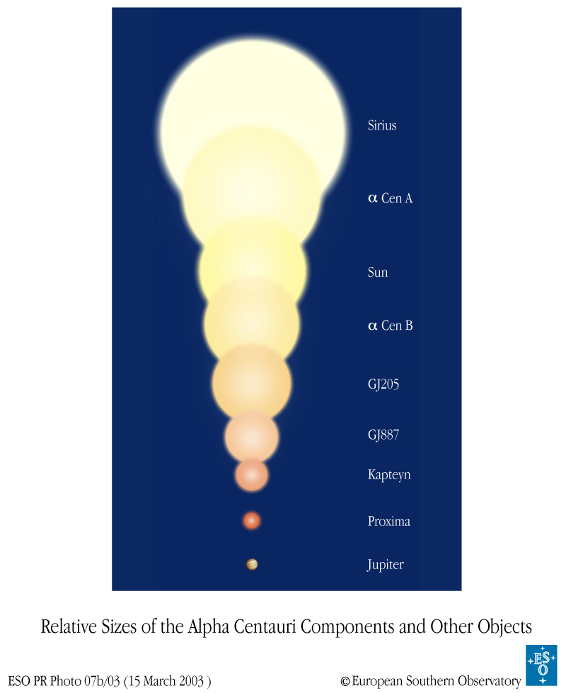 The relative sizes of a number of objects, including the three (known) members of Alpha Centauri triple system and some other stars for which the angular sizes have also been measured with Very Large Telescope Interferometer (VLTI) at the ESO Paranal Observatory (Chile) during the past year, cf. ESO PR 22/02. The Sun and planet Jupiter are shown for comparison.