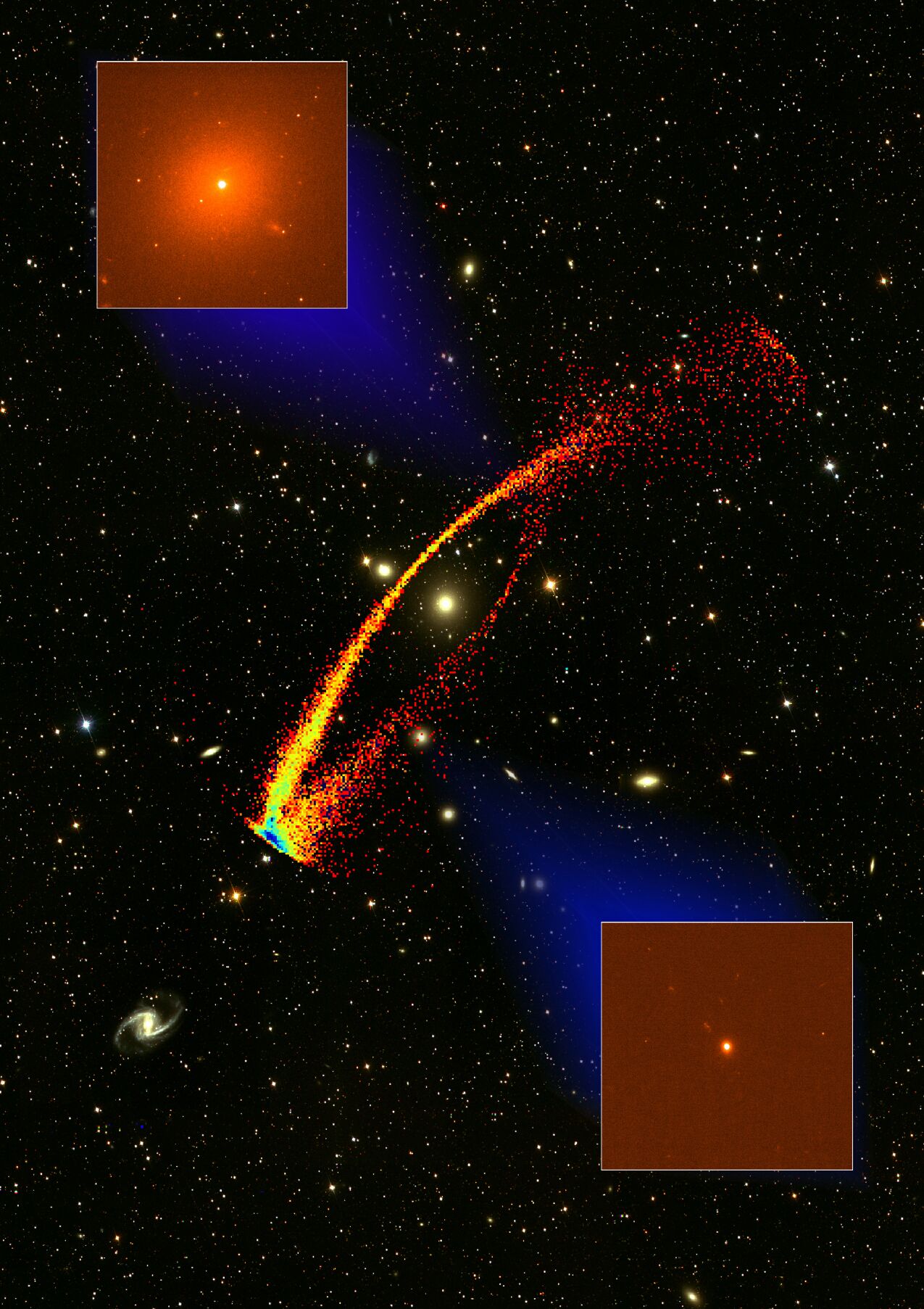 The Fornax Cluster of galaxies with insets, 60-times magnified, of a normal dwarf galaxy (upper) and a newly-discovered "ultra-compact dwarf" (UCD) galaxy (lower). A simulation of the remains of a a normal dwarf galaxy after disruption to form a UCD is shown in the centre. Credits: Insets: Hubble Space Telescope; background Michigan Curtis Schmidt Telescope and Arna Karick (University of Melbourne).