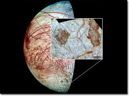 This image of Europa and an enlargement of the Thrace region gives visual evidence of the dramatic advance in our knowledge of Jupiter's second Galilean satellite due to the Galileo mission.