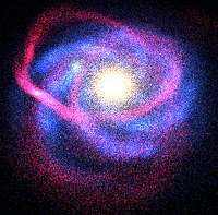 A simulation. The Milky way (blue) swallows up a nearby neighbour (pink) Credit: Nicolas Martin & Rodrigo Ibata, Observatoire de Strasbourg