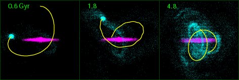 A model of the satellite galaxy (blue) being destroyed by the larger galaxy (pink) over several billion years.