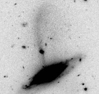A HST ACS image of the satellite galaxy, with tidal tails of stars being pulled out of it by the gravitational field of the larger galaxy.