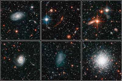 Five background galaxies beyond M31. Most show distortions consistent with recent interactions. The stars in these panels are located in Andromeda's halo. The object [bottom row, right] is a a globular cluster, located in M31's halo. Credit: NASA, ESA and T.M. Brown (STScI)