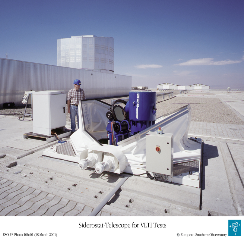One of the siderostats is placed at a station and prepared for observations. The tracking mirror can be seen and the (blue) vertical tube through which the light beam is sent down into the Interferometric Tunnel. Credit: ESO