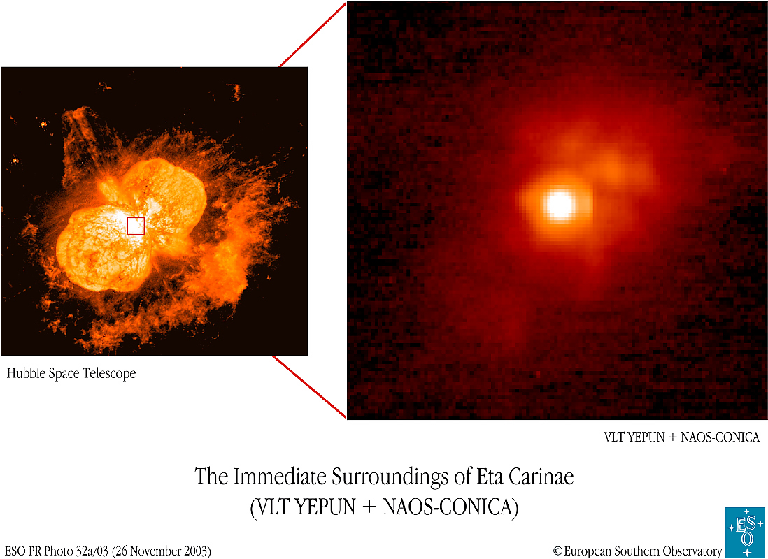 The image to the left shows the mushroom-shaped clouds, known as the Homunculus Nebula, that surround the massive star Eta Carinae (Credit: NASA/ESA HST). To the right is an image obtained with the VLT NACO adaptive-optics camera that reveals the structure of the star's immediate surroundings. The central region displays a complex morphology of luminous objects.