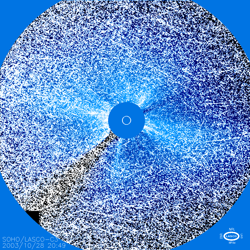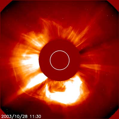 One of the largest solar flares has been detected. At about 1100 GMT 28th October, 2003, satellites watched as the event occurred. The flare was significantly larger than several unleashed since last week. The outburst was classified an X17.2 flare, the third largest on record. The Earth was immediately affected by intense X-ray radiation, which ionised the upper layers of the atmosphere, causing serious disruption to radio communications. Solar flares are associated with coronal mass ejections, or CMEs, eruptions from the sun that, if headed our way, can also disrupt power grids.