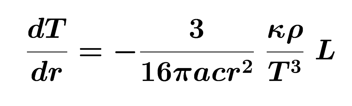 This equation shows that the rate of change of temperature with radius is related to several constants, opacity, density, luminosity and (inversely) to the cube of the temperature itself. |