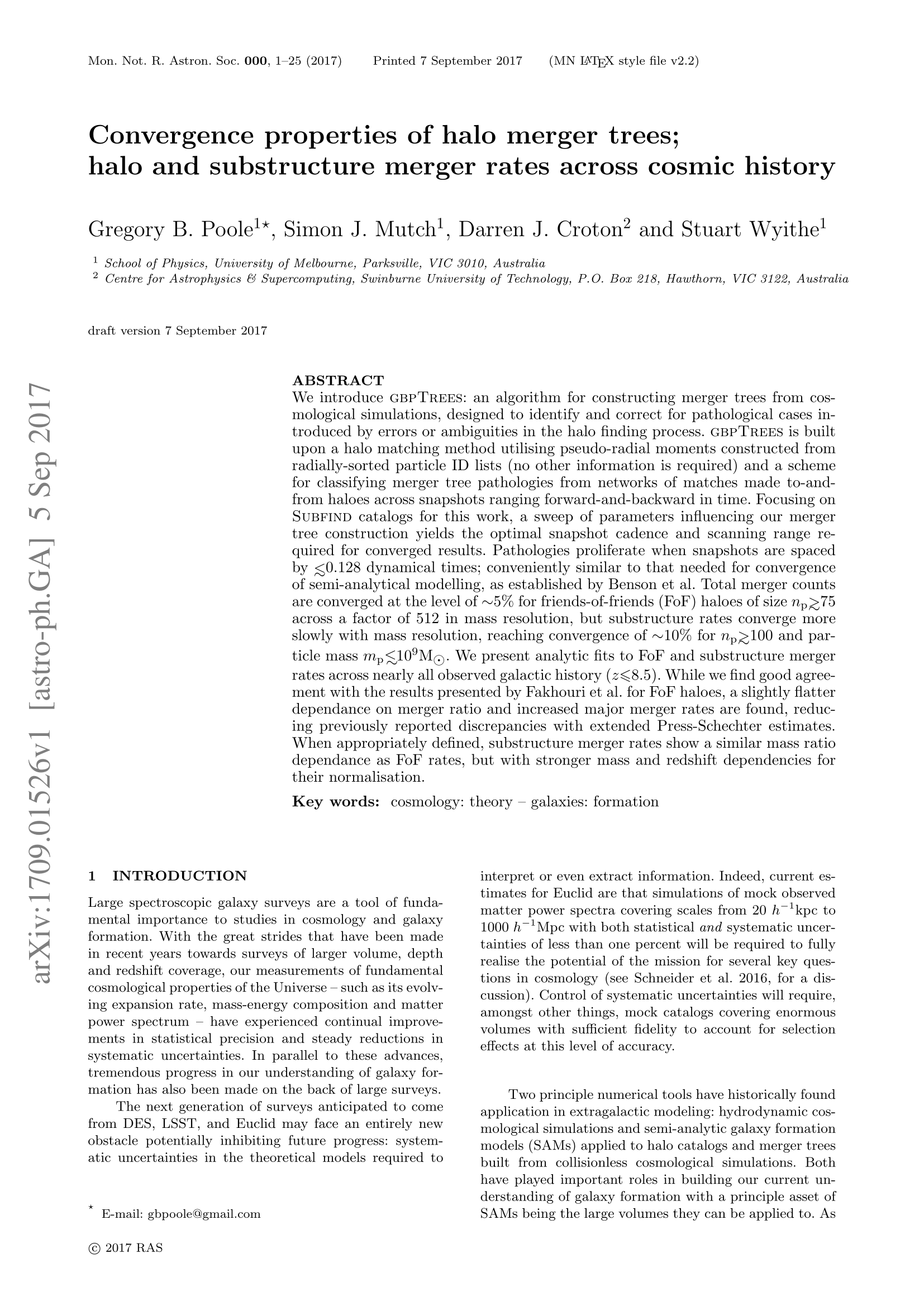 This study presents the gbpTrees algorithm and uses it to condect a detailed convergence study of merger tree construction with a configuration space halo finder. Merger rates for friends-of-friends halos and substructures across nearly all observed galactic history are presented.